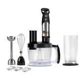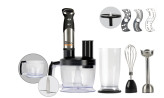 همچنین این دسته دارای دو دکمه با عملکردهای مختلف است، که یکی برای روشن کردن و دیگری برای تنظیم سرعت است. تیغههای گوشت کوب از جنس استیل ضد زنگ بوده و قدرت زیادی ( 600 وات ) در له کردن مواد غذایی دارد. این تیغه به راحتی از دسته جدا شده و قابلیت شستشوی آسان نیز دارد. میله همزن نیز در این مدل جهت تهیه کیک و هم زدن مواد مختلف به کار میرود. ظرف خرد کن با ظرفیت 0.5 لیتری و تیغههای دو پره برای خردکردن مواد مختلف استفاده میشود. یک ظرف مدرج 1250 میلیلیتری نیز برای رنده کردن مواد به همراه این گوشت همه کاره تعبیه شده است، که کارایی بیشتر گوشت کوب را به همراه داشته است.